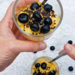 Serveer de parfaits met verse blauwe bessen en bestrooi met pure chocoladedruppels. Besprenkel met een beetje honing voor een extra zoete touch.
